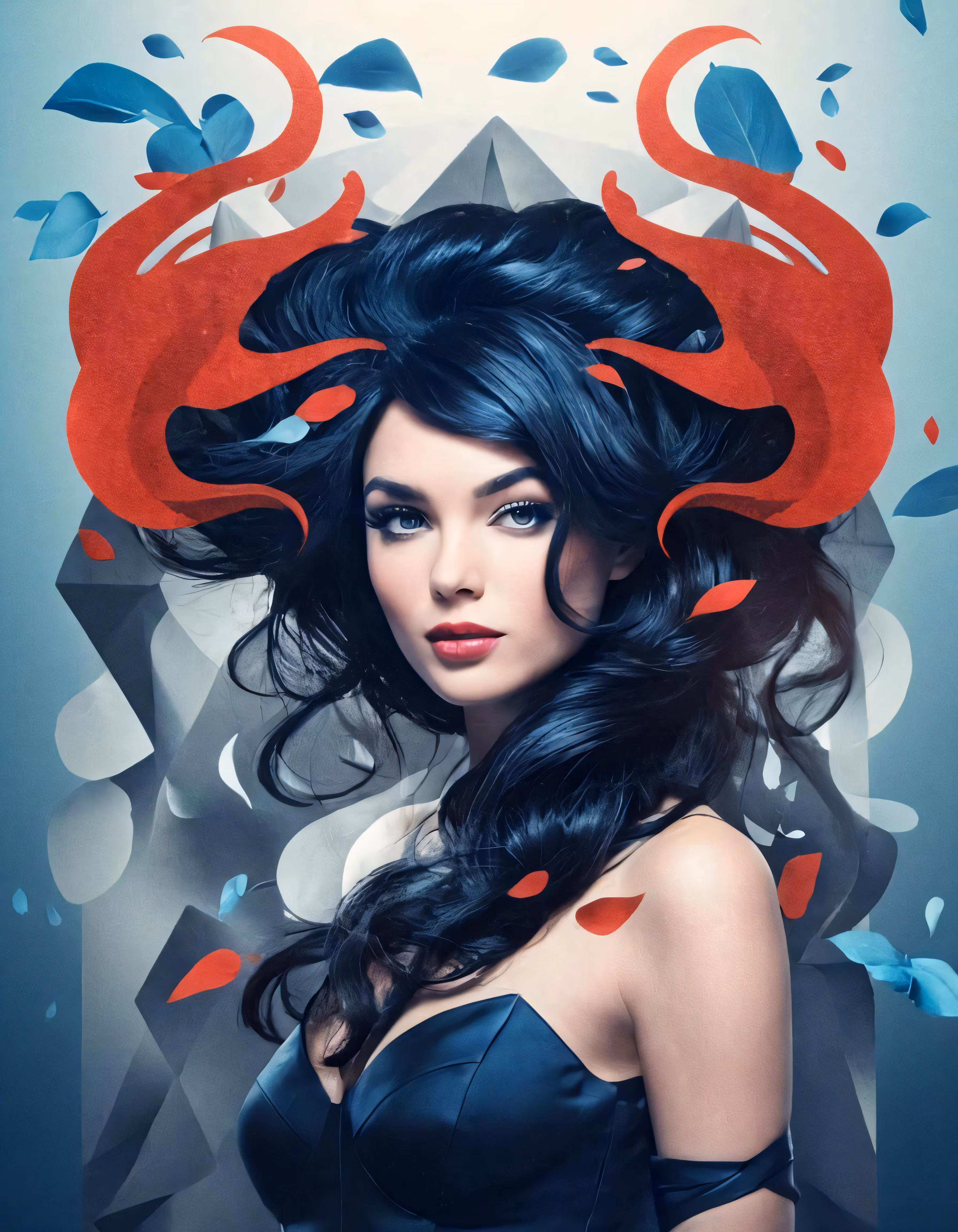 High resolution picture, free to use, woman with black hair and wings is wearing a dark costume and red gloves