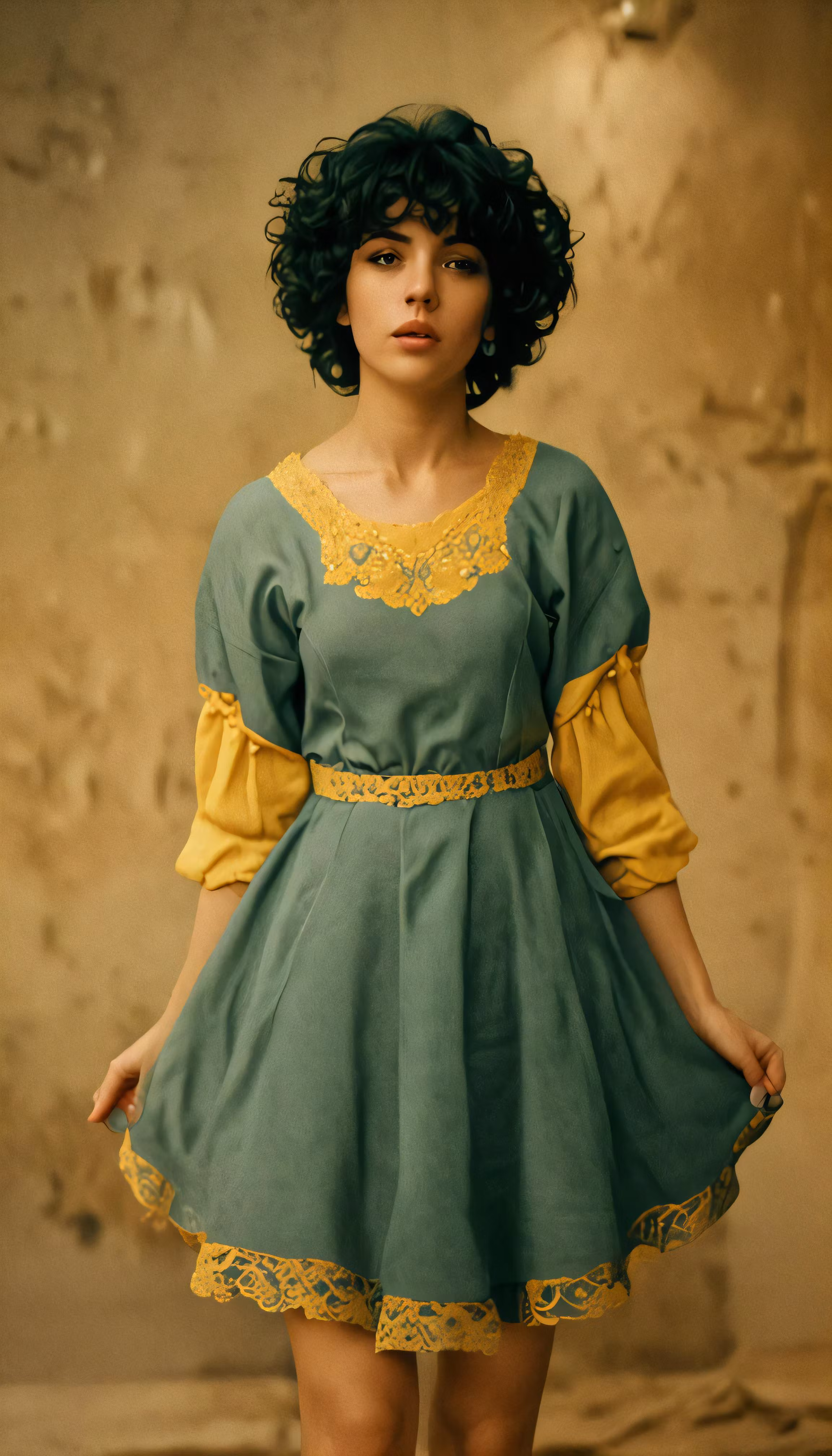 High resolution picture, free to use, woman with black hair wearing green dress and yellow shirt