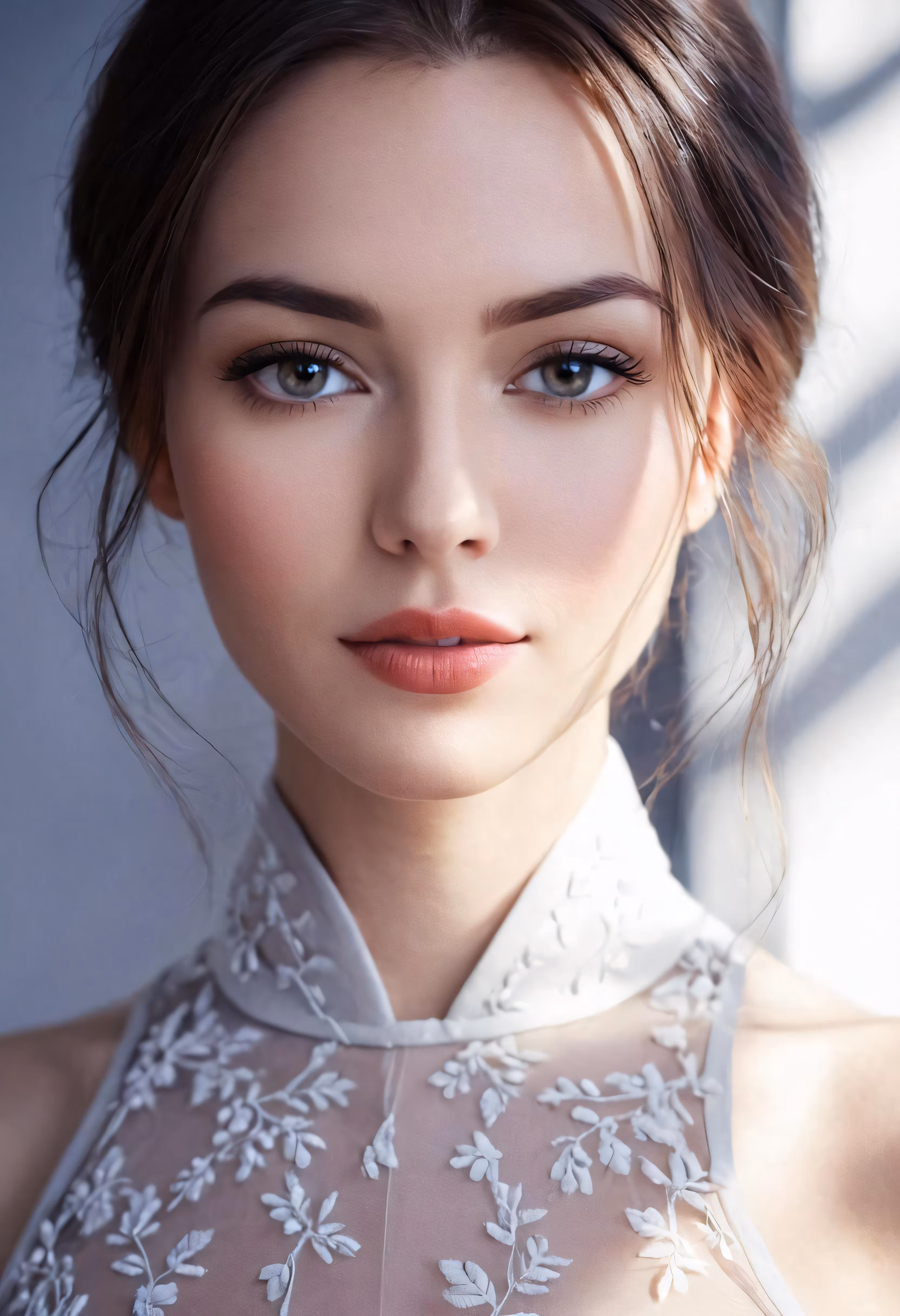 High resolution picture, free to use, woman with blue eyes wearing an embroidered blouse