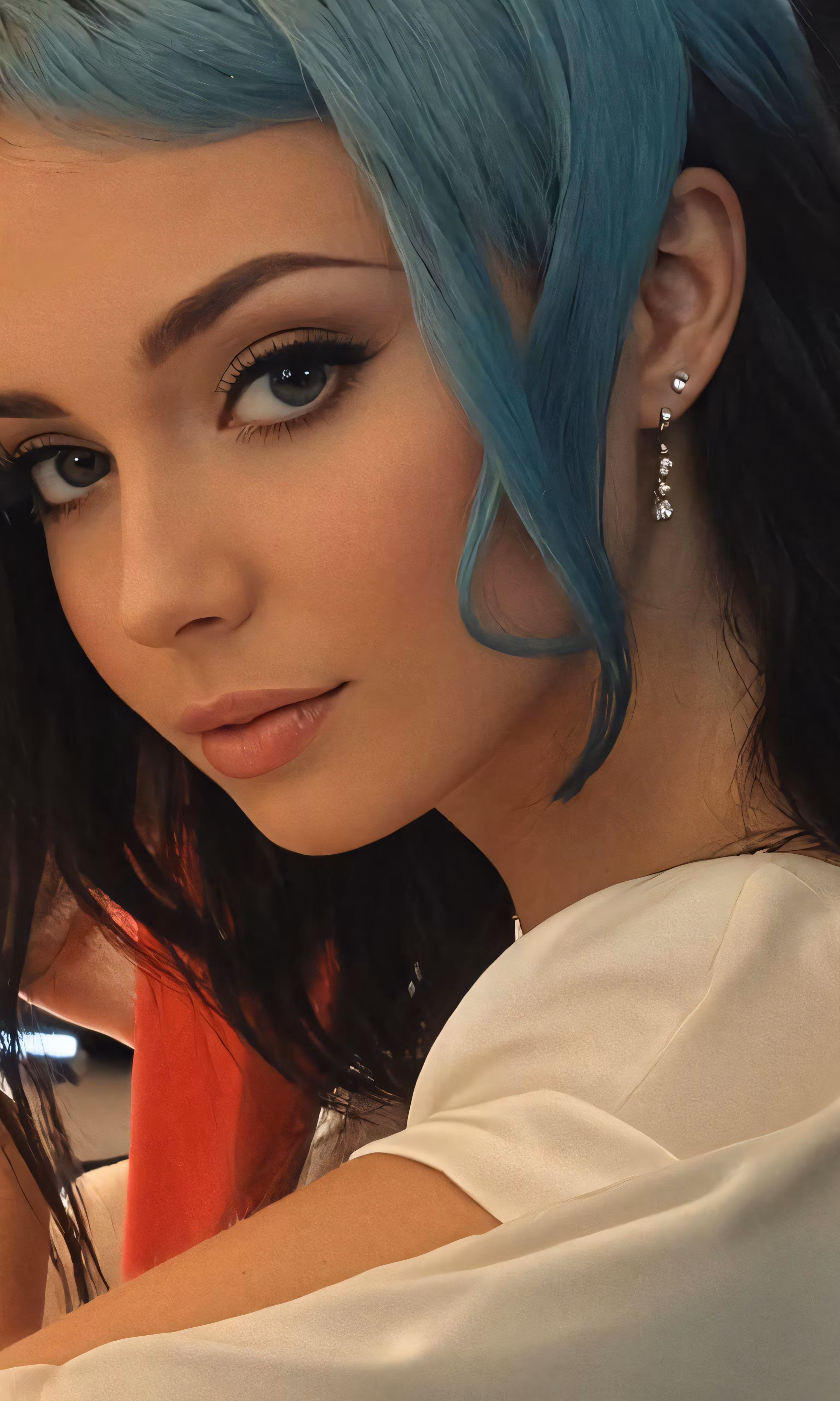 High resolution picture, free to use, woman with blue hair wearing white and blue ring