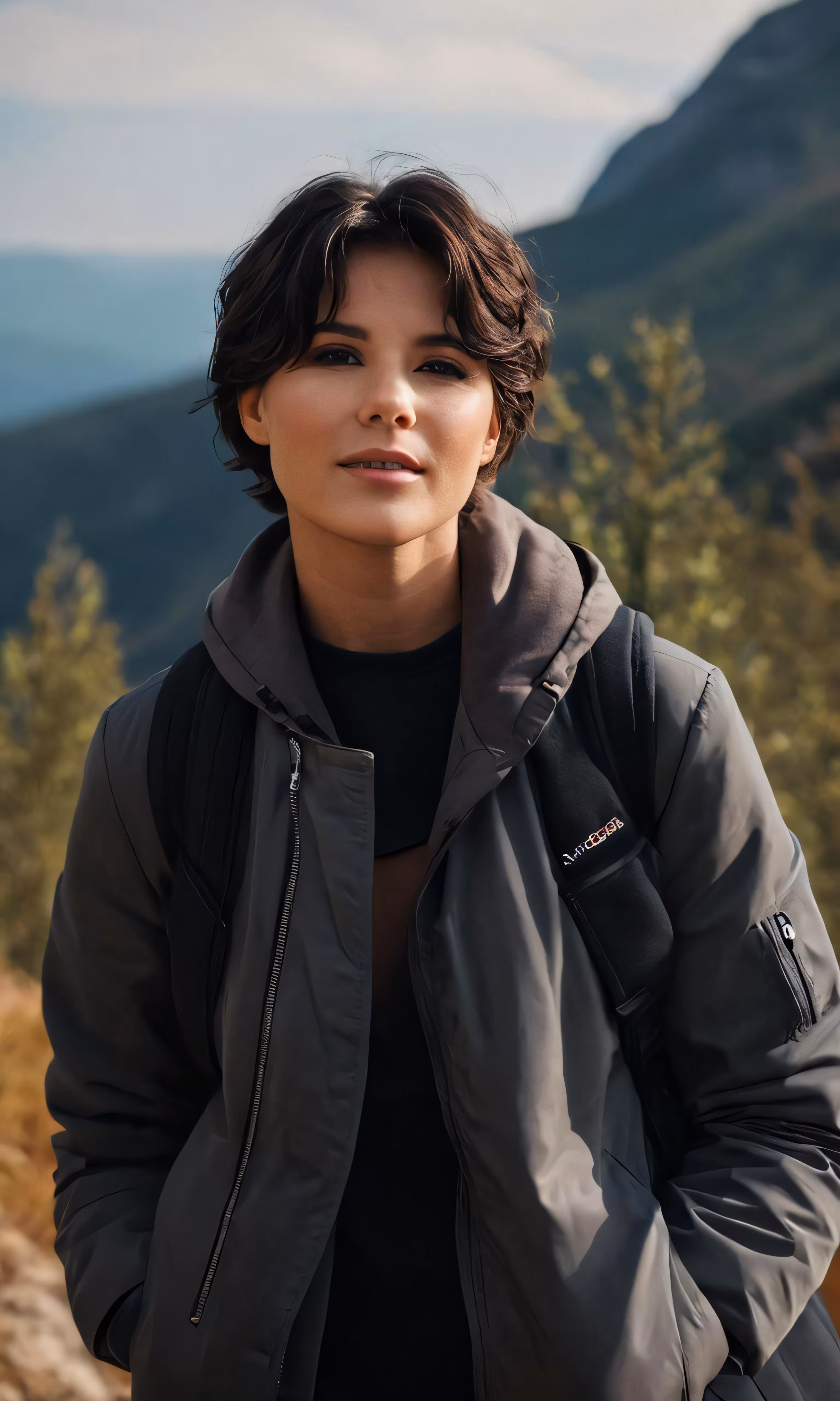 High resolution picture, free to use, woman with hood on and mountains in the background