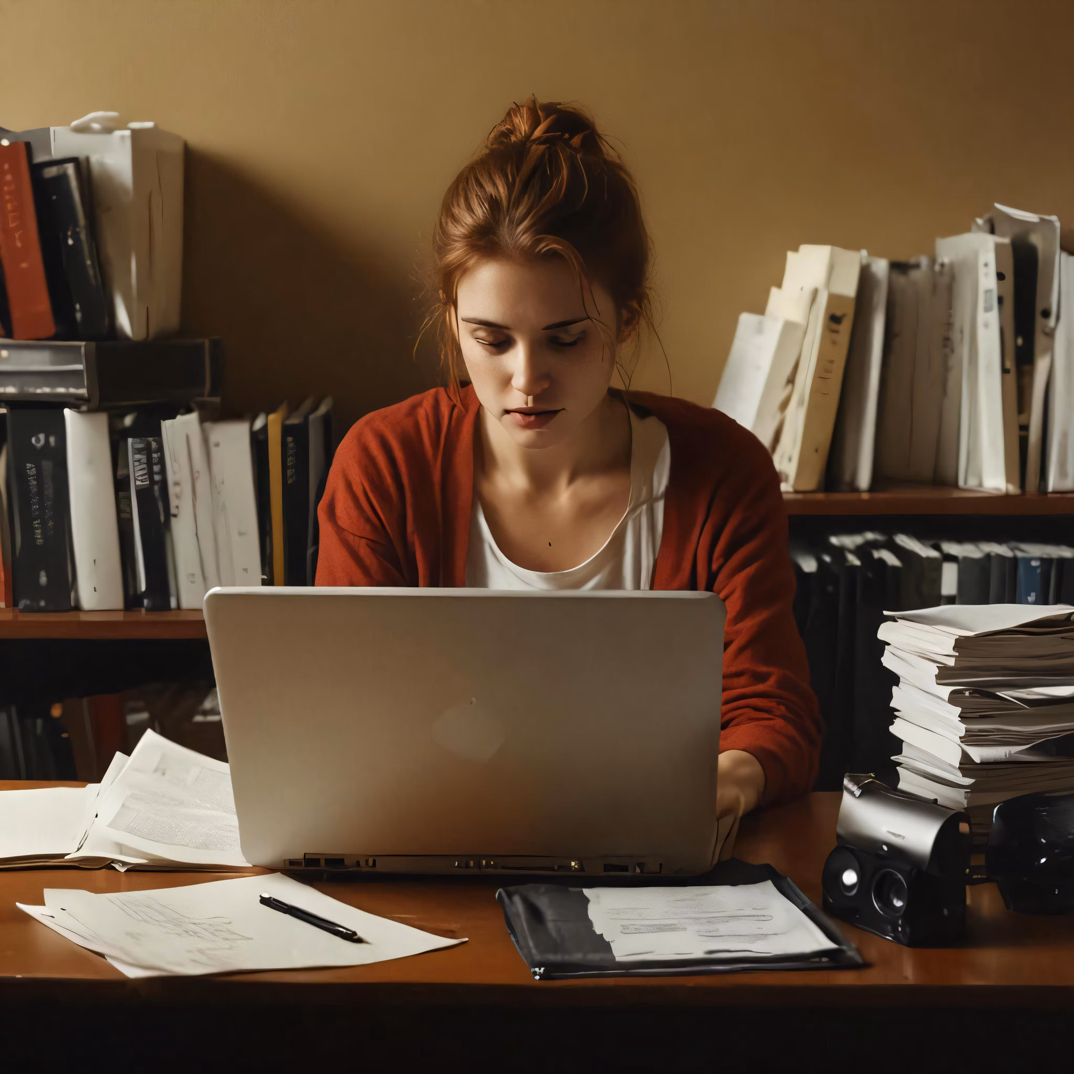 High resolution picture, free to use, woman with laptop and stacks of papers on table