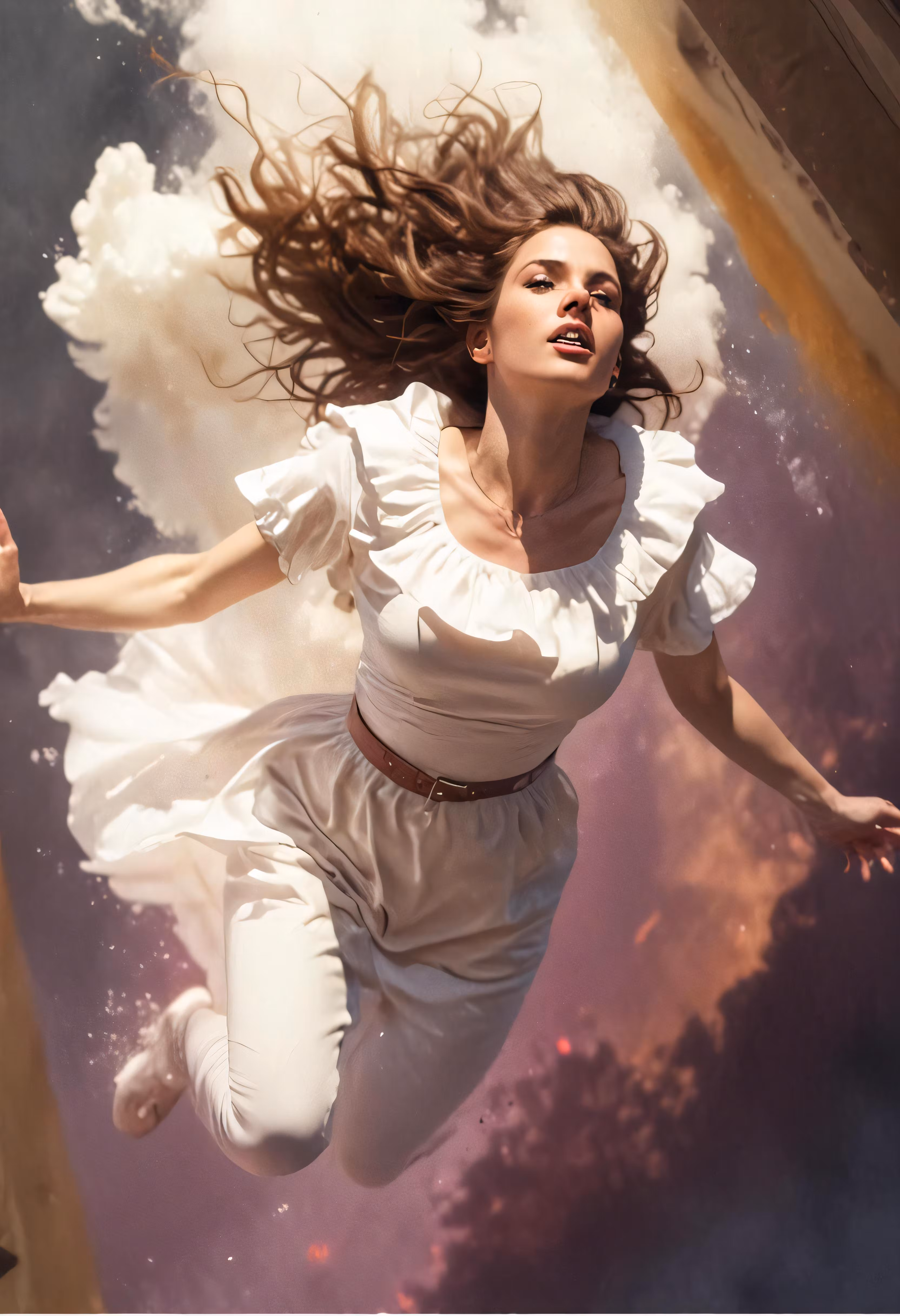 High resolution picture, free to use, woman with long hair in white outfit flying through the air
