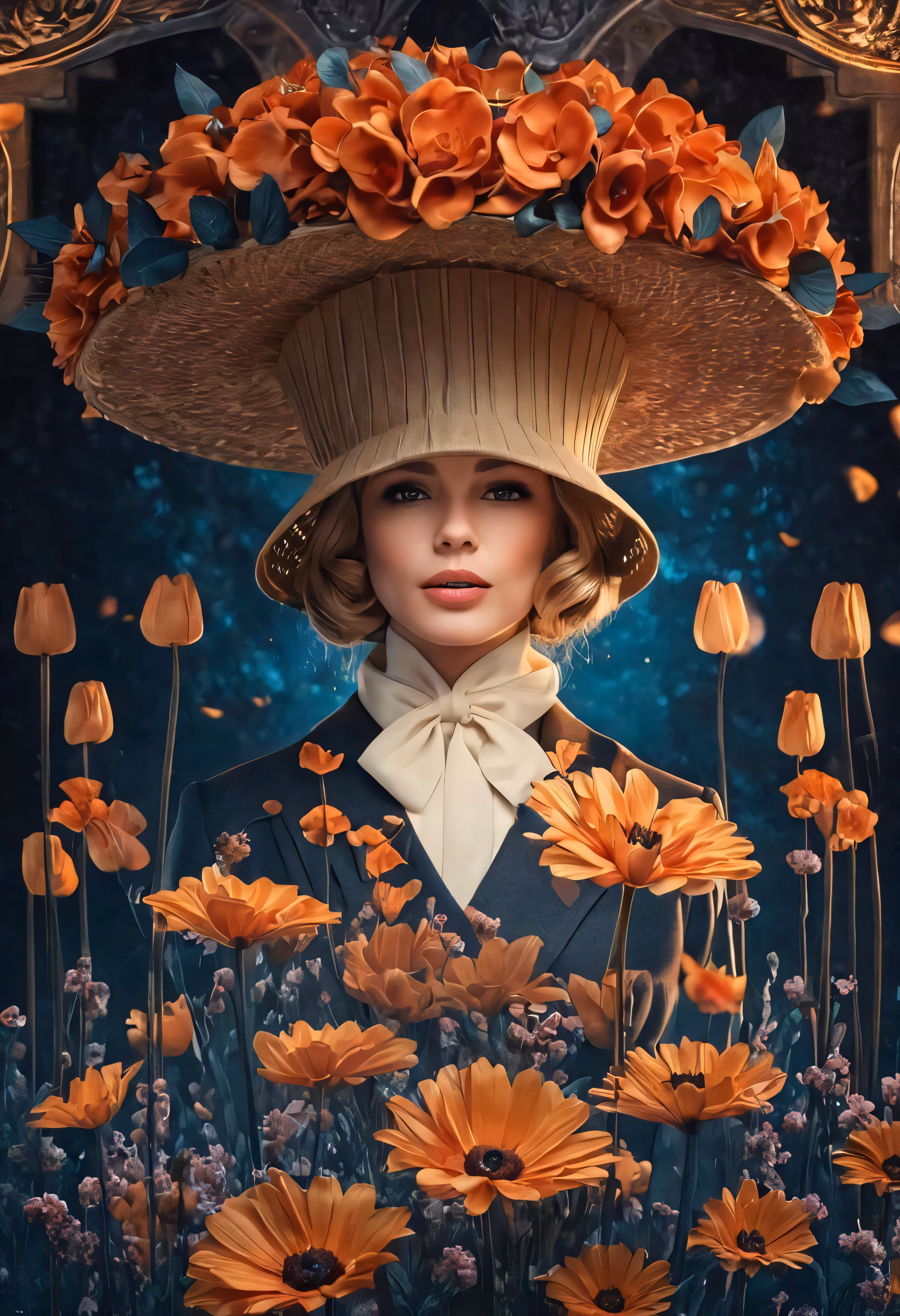 High resolution picture, free to use, woman with orange flowers and large hat and blue background