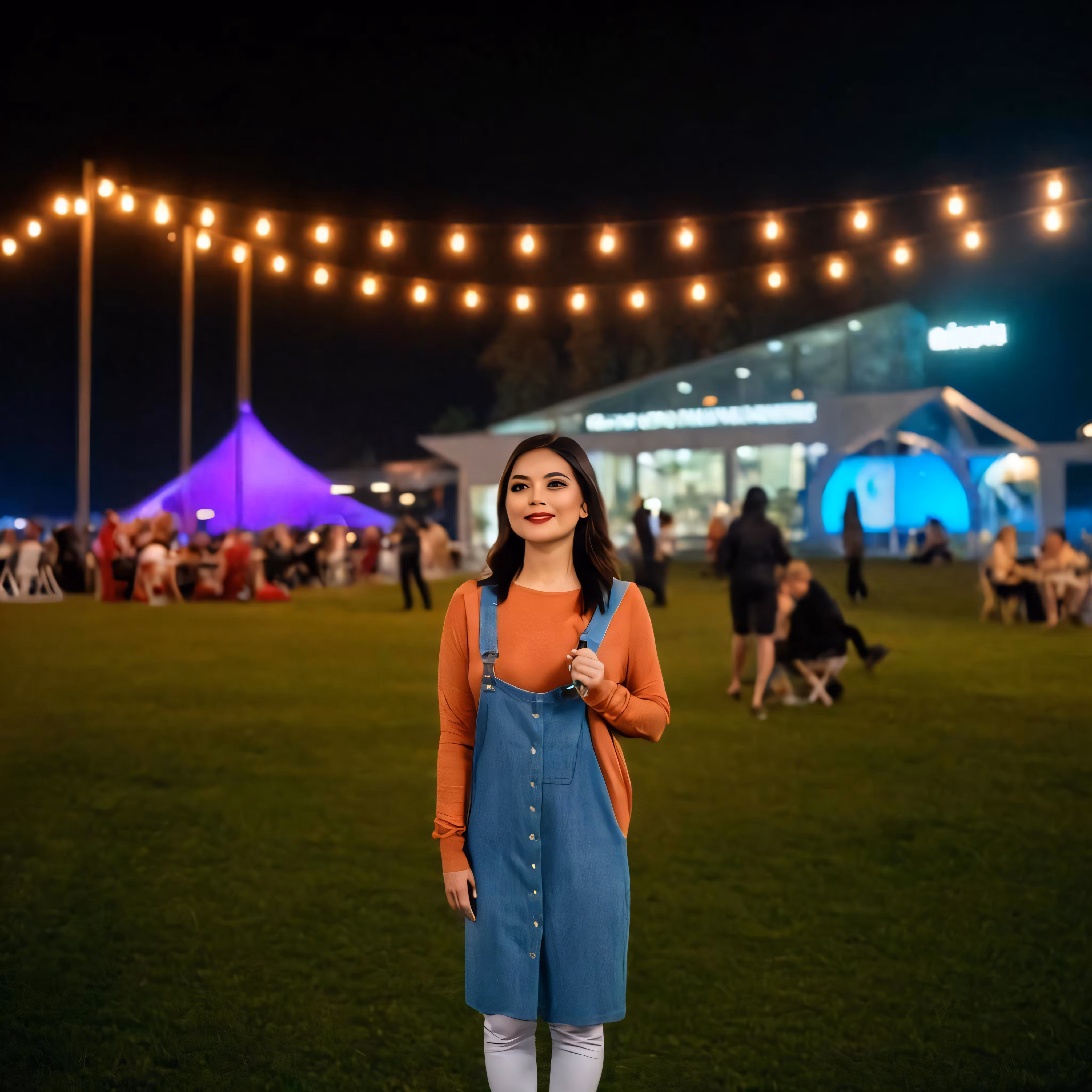 High resolution picture, free to use, woman with orange sweater and dress in a green field