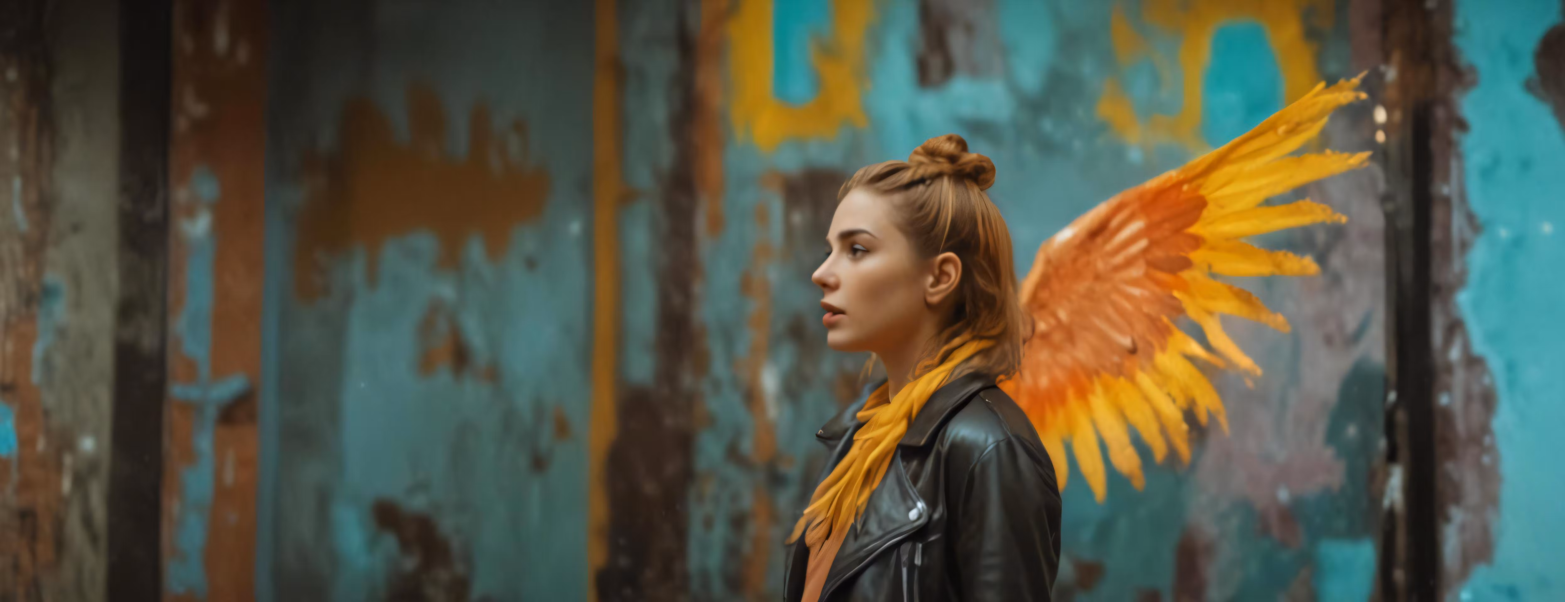 High resolution picture, free to use, woman with orange wings standing in front of rusty wall