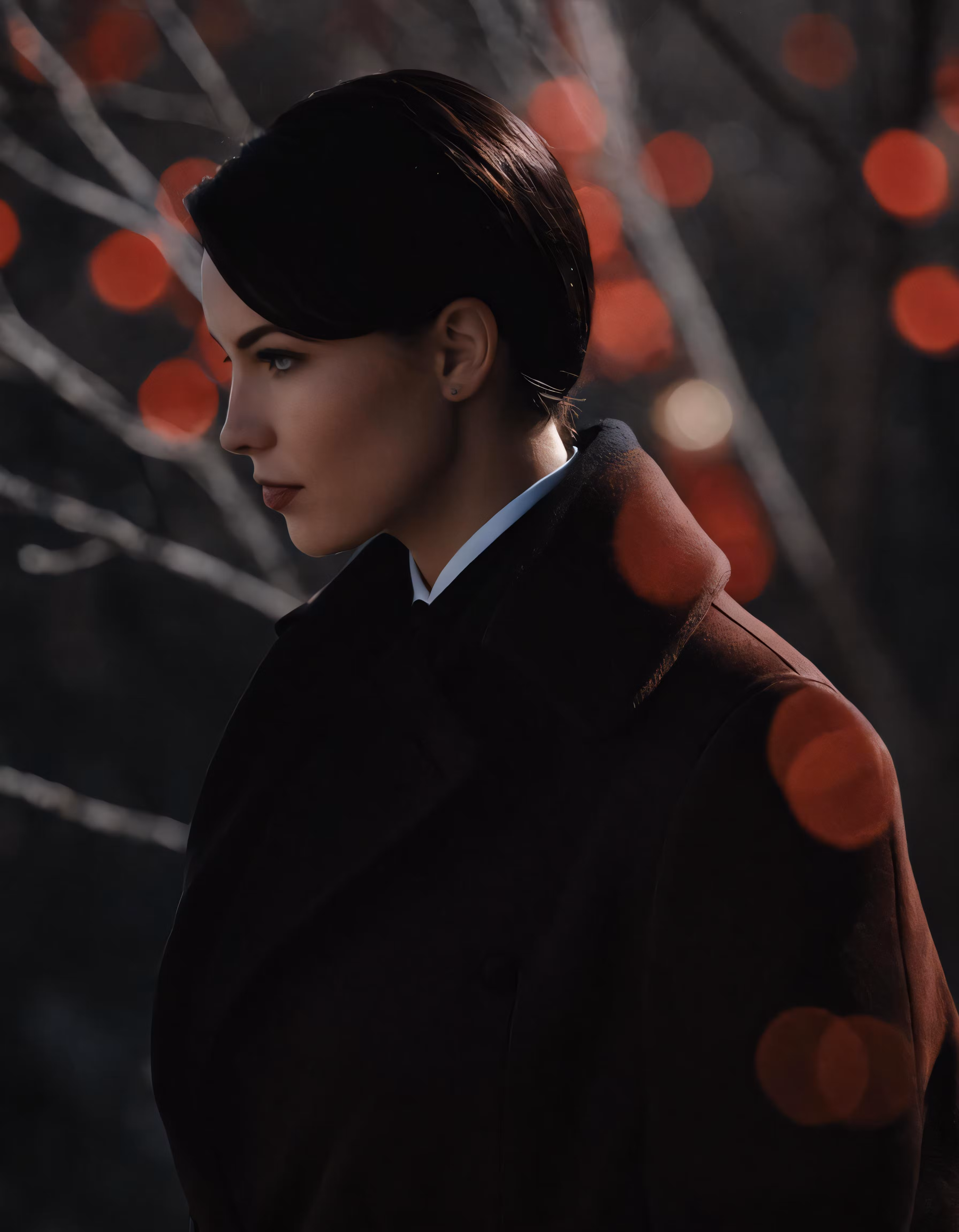 High resolution picture, free to use, woman with red lights behind her head in an image of the night