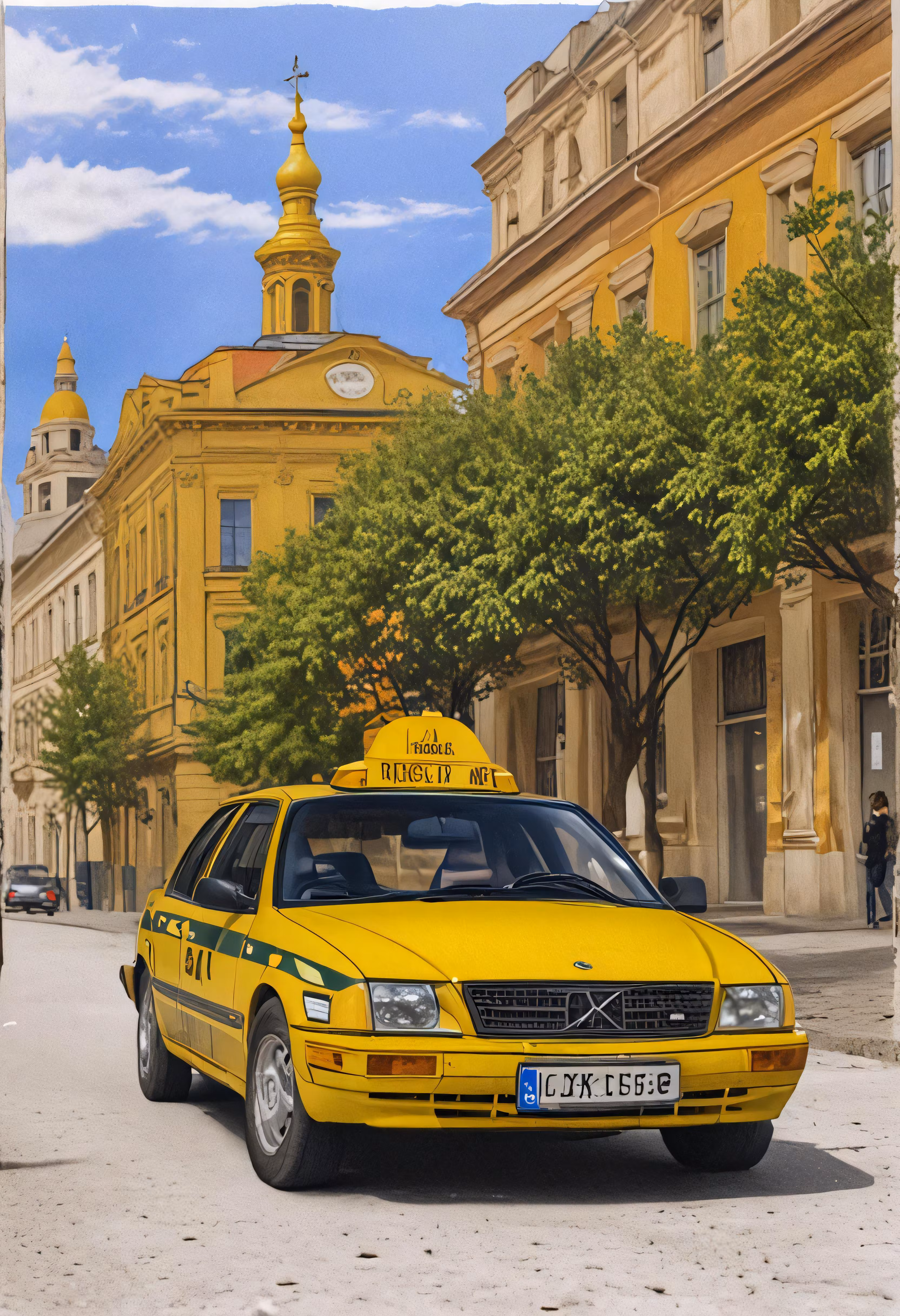 High resolution picture, free to use, yellow taxi cab parked on the street with other taxis near by