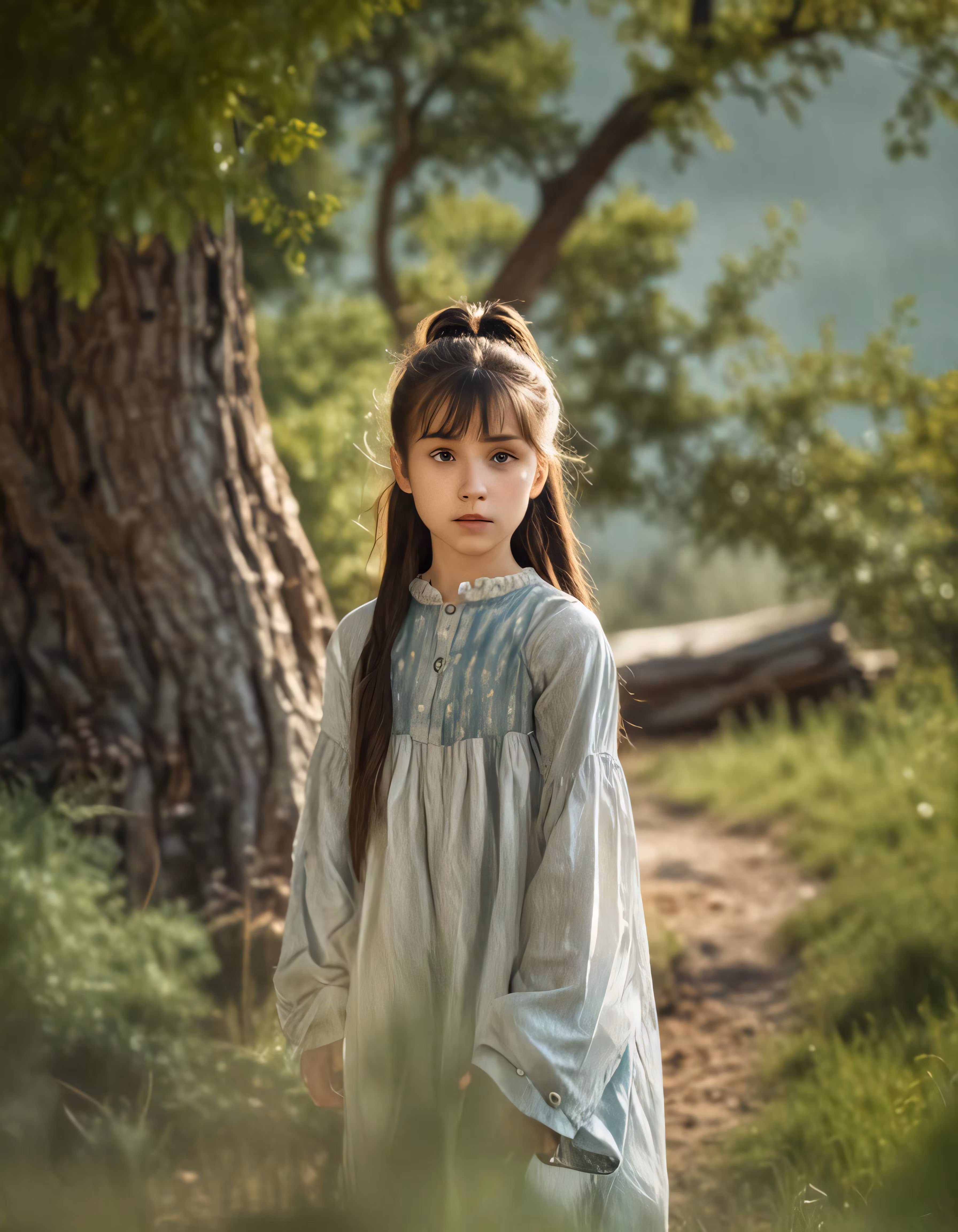 High resolution picture, free to use, young girl in dress near a tree in a forest