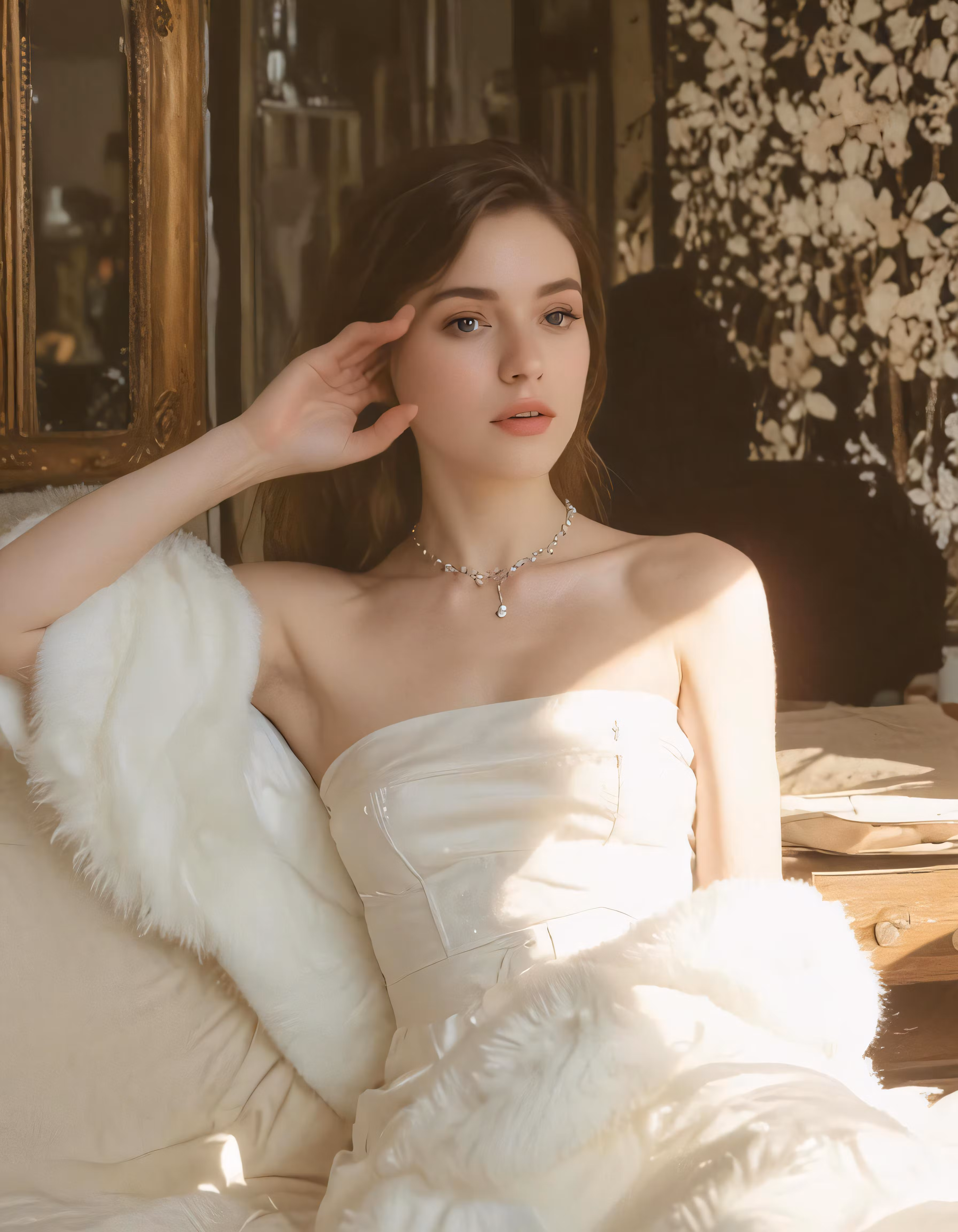 High resolution picture, free to use, young lady in white dress posing for picture wearing elegant diamond necklace