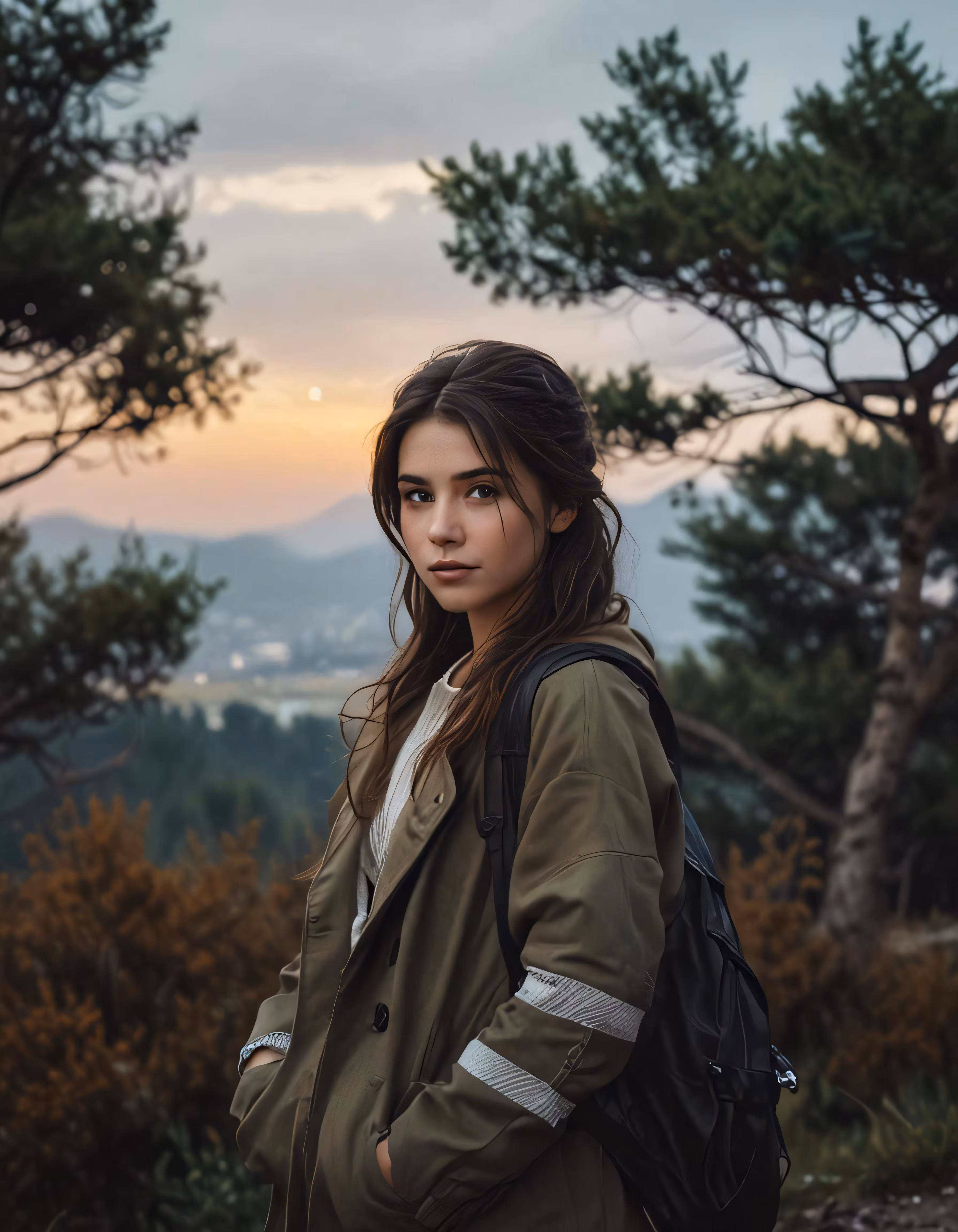 High resolution picture, free to use, young woman at the top of a hill wearing a military style jacket
