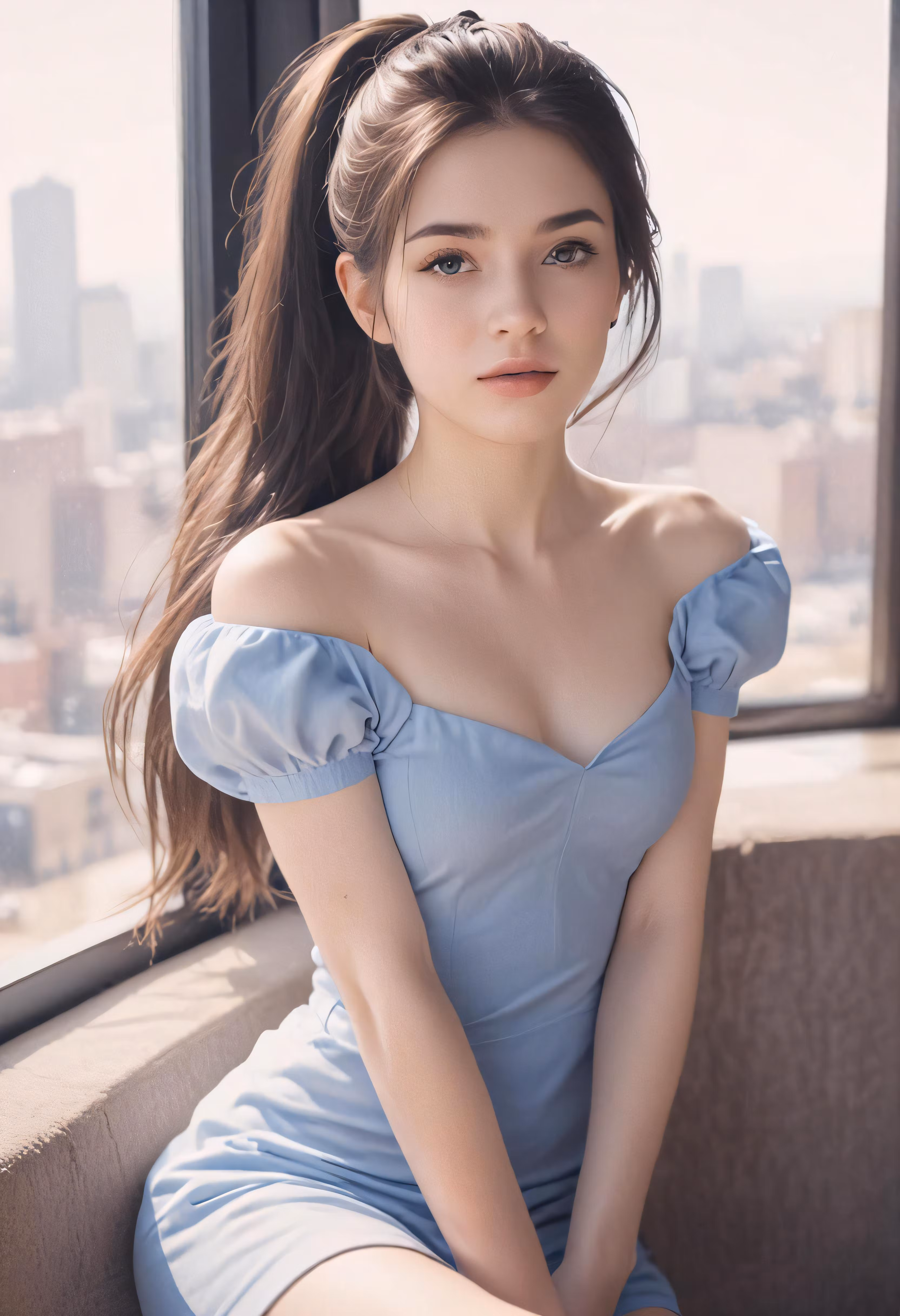 High resolution picture, free to use, young woman in blue dress sitting and posing