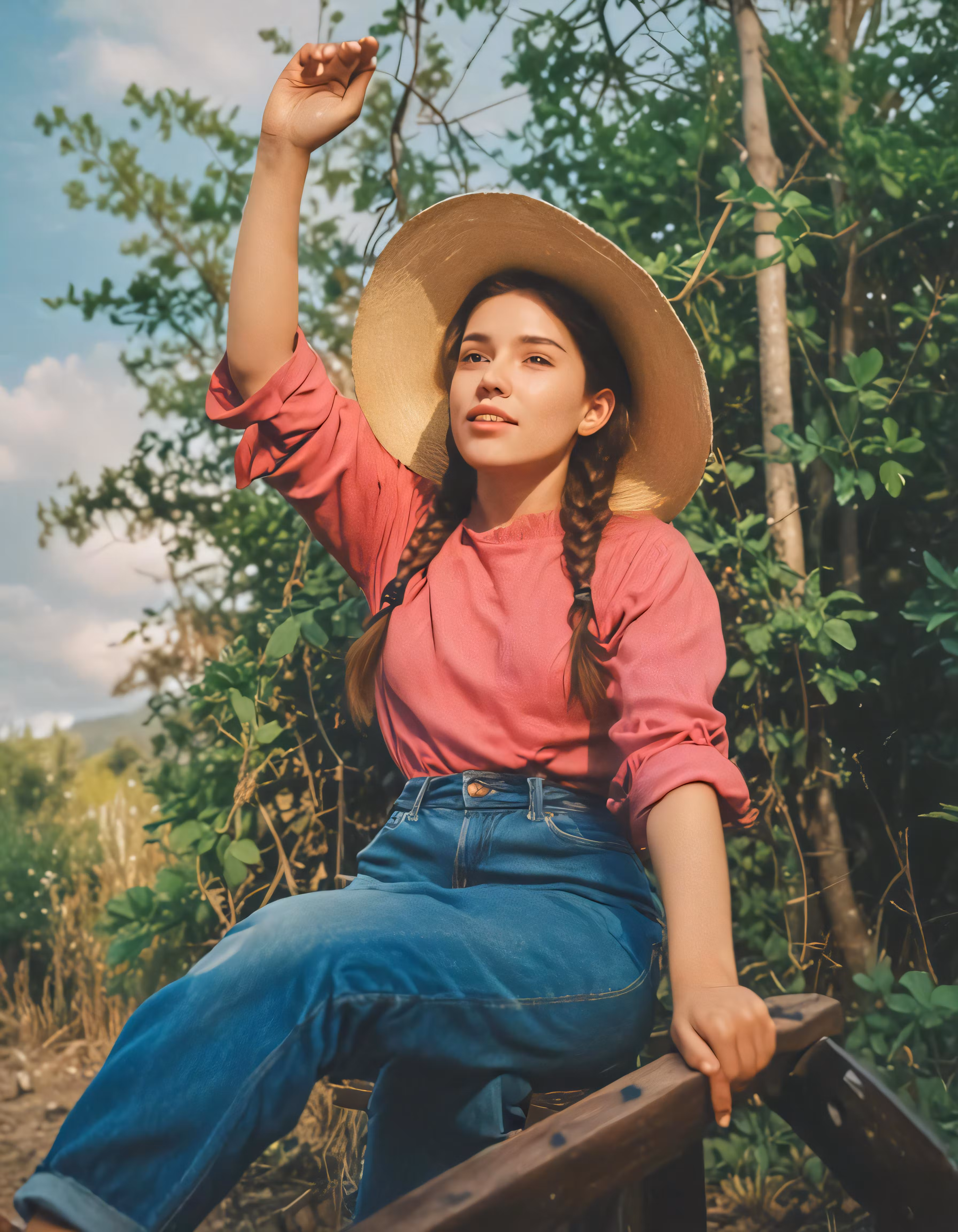 High resolution picture, free to use, young woman in straw hat sitting on wooden structure