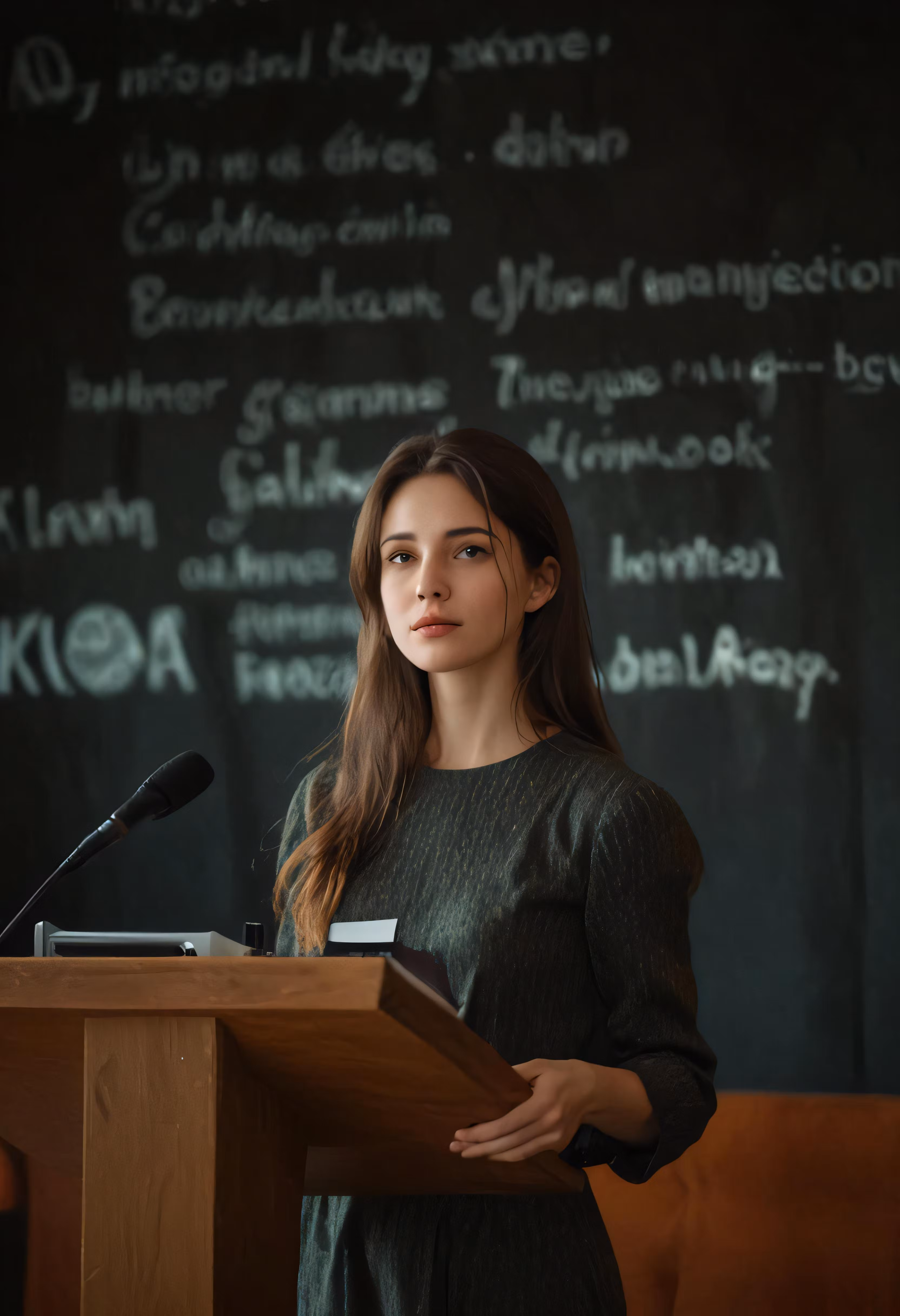 High resolution picture, free to use, young woman standing in front of a wooden podium and giving a speech